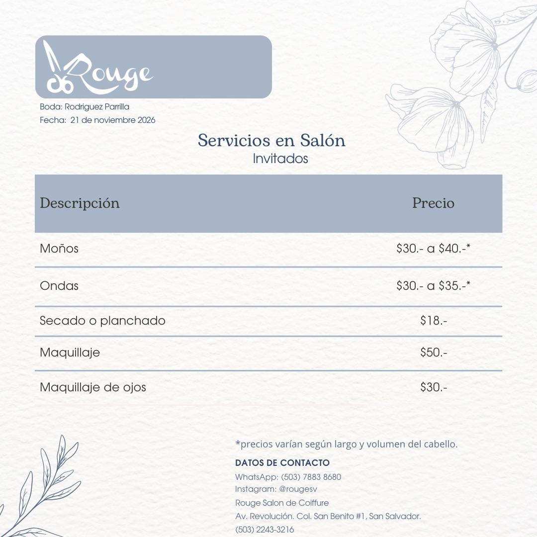 Hair and Makeup Body & Beauty Salon Hotel Sheraton, Presidente Av. La Revolución, Col. San Benito @bbeautysv Makeup: $35Hairdos starting at $30 SEND WHATSAPP MESSAGE Rouge Salon Av. La Revolución #1, Col. San Benito @rougesv View prices SEND WHATSAPP MESSAGE